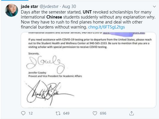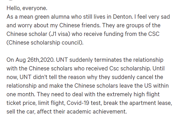 在美國請愿類信息網站“Change.org”上,一則為北得克薩斯州大學的中國留學生求助的網貼就表示,該校是在8月26日當天突然宣布中止受中國國家留學基金委員會資助的訪問學生和學者的學習資格的,并要求這些持有J-1類簽證的中國公派留學生和學者在1個月內離境。可該校至今也沒有透露這么做的原因是什么。