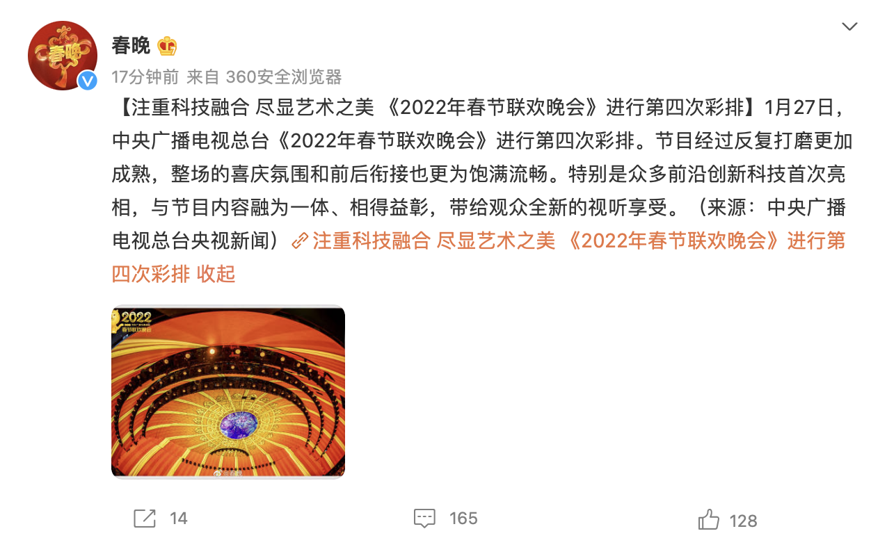 1月27日消息,據(jù)春晚官方微博消息,1月27日,中央廣播電視總臺(tái)《2022年春節(jié)聯(lián)歡晚會(huì)》進(jìn)行第四次彩排,眾多前沿創(chuàng)新科技首次亮相,與節(jié)目內(nèi) ...