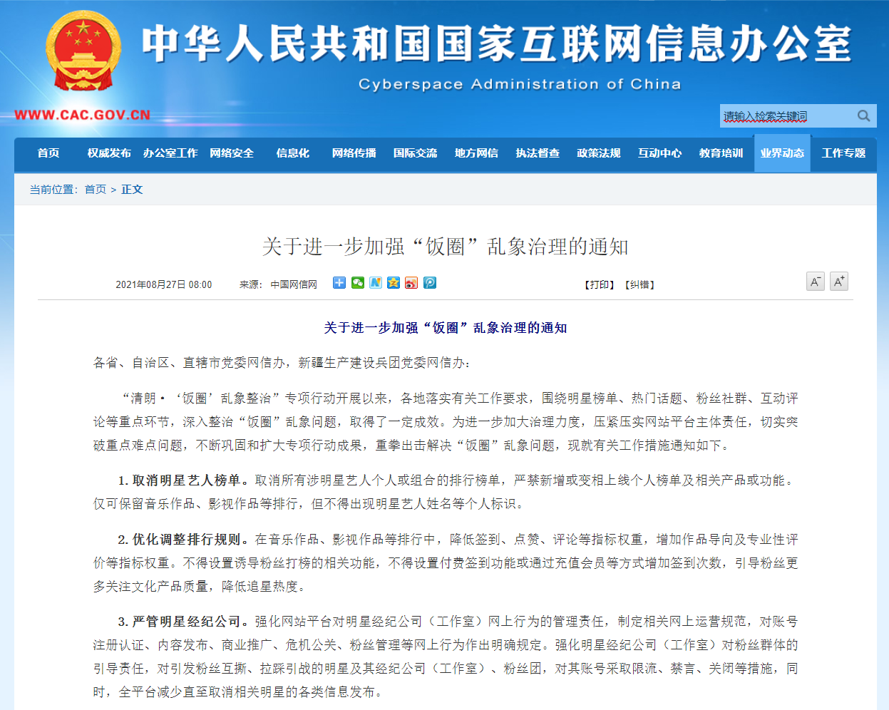 近日國(guó)家網(wǎng)信辦發(fā)布了《關(guān)于進(jìn)一步加強(qiáng)飯圈亂象治理的通知》。通知表示,清朗?‘飯圈’亂象整治專(zhuān)項(xiàng)行動(dòng)開(kāi)展以來(lái),各地落實(shí)有關(guān) ...