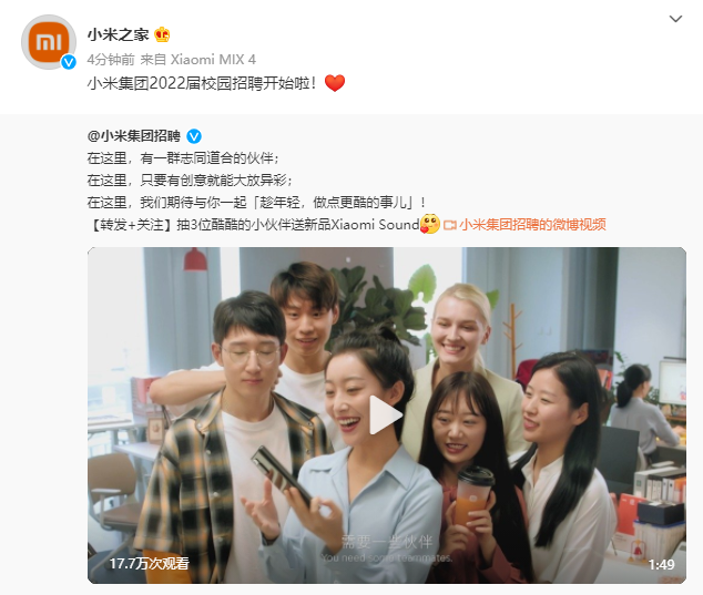 小米集團(tuán)2022全球校園招聘啟動(dòng):提供軟硬件開(kāi)發(fā)等11個(gè)崗位