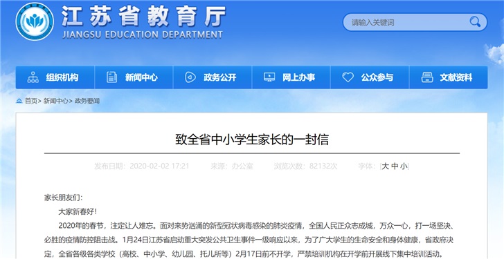 日前,江蘇省政府決定,全省各級(jí)各類(lèi)學(xué)校(高校、中小學(xué)、幼兒園、托兒所等)2月17日前不開(kāi)學(xué),嚴(yán)禁培訓(xùn)機(jī)構(gòu)在開(kāi)學(xué)前開(kāi)展線(xiàn)下集中培訓(xùn)活動(dòng)。 ...