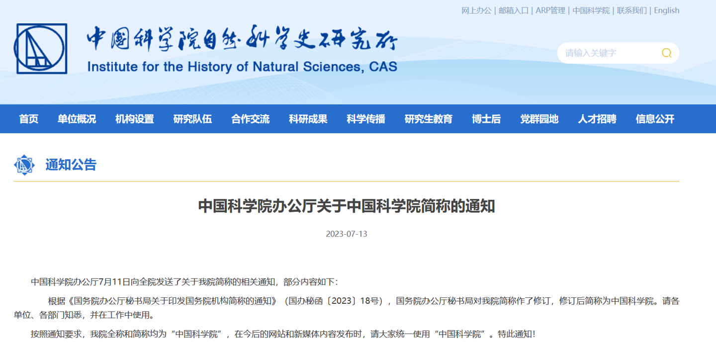據(jù)中國(guó)科學(xué)院官方消息,中國(guó)科學(xué)院辦公廳7月11日向全院發(fā)送了關(guān)于中國(guó)科學(xué)院簡(jiǎn)稱(chēng)的相關(guān)通知,部分內(nèi)容如下:根據(jù)《國(guó)務(wù)院辦公廳秘書(shū)局關(guān)于 ...