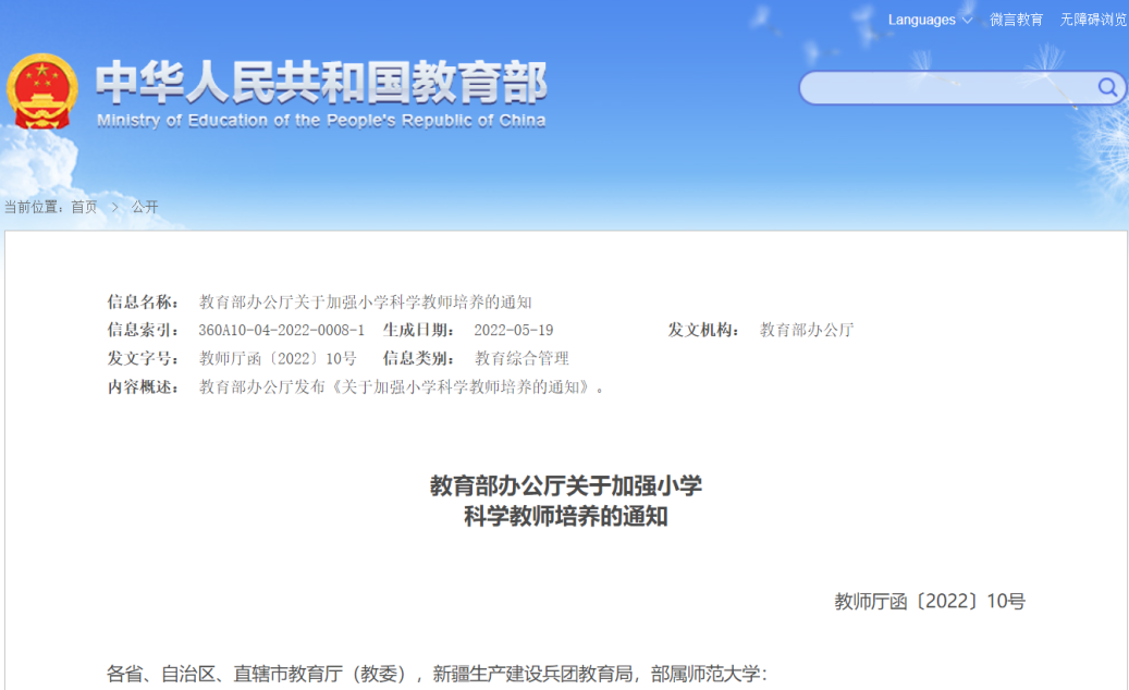 近日,教育部發(fā)布《關(guān)于加強小學科學教師培養(yǎng)的通知》(下簡稱《通知》),提出要建強一批培養(yǎng)小學科學教師的師范類專業(yè),從源頭上加強本科及 ...