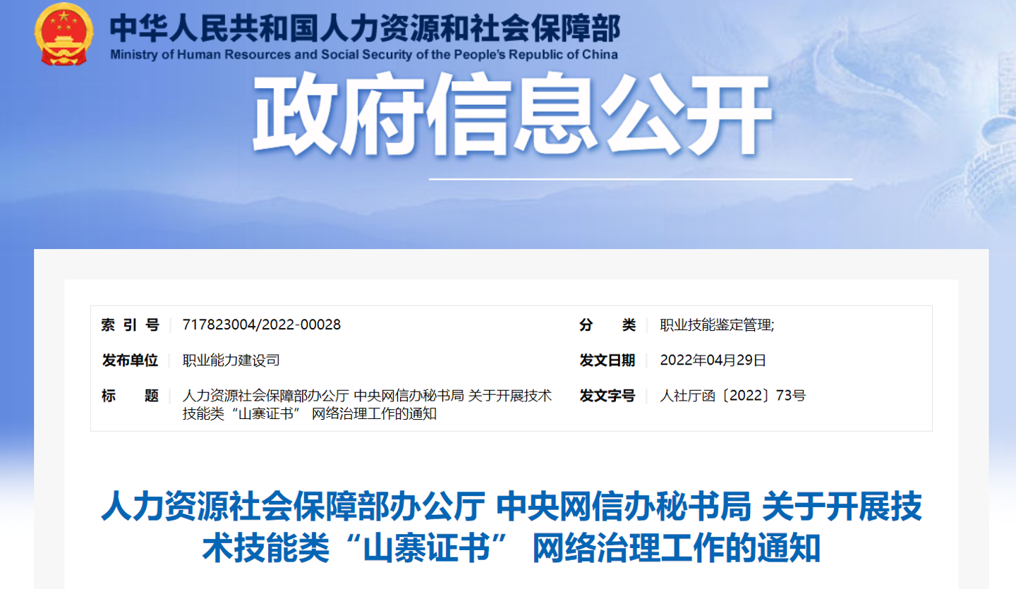 據(jù)工人日報報道,日前,兩家打著職業(yè)資格幌子發(fā)放山寨證書牟利的網(wǎng)站被查處關(guān)停。今年3月,人社部、中央網(wǎng)信辦印發(fā)了《關(guān)于開展技術(shù)技能類 ...