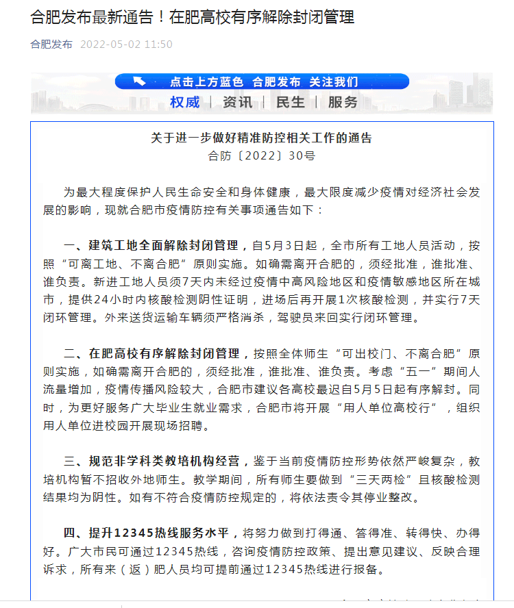 合肥最新通告!建議在肥高校最遲自5月5日起有序解封
