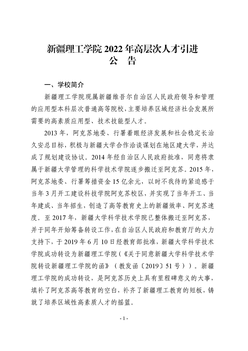 2013年,阿克蘇地委、行署著眼經濟發(fā)展和社會穩(wěn)定長治久安總目標,積極與新疆大學合作洽談謀劃在地區(qū)建大學,并達成了規(guī)劃建設協(xié)議。2014年經自治區(qū)人民政府批準,同意將隸屬于新疆大學管理的科學技術學院逐步搬遷至阿克蘇。2015年,阿克蘇地委、行署籌措資金15億余元,以時不我待的緊迫感于當年3月開工建設科技學院阿克蘇校區(qū),并實現(xiàn)了當年開工、當年建成、當年招生,創(chuàng)造了高等教育史上的新疆效率、阿克蘇速度。至2017年,新疆大學科學技術學院已整體搬遷至阿克蘇,并于同年開始籌備轉設工作,在自治區(qū)人民政府和教育廳的大力支持下,于2019年6月10日經教育部批準,新疆大學科學技術學院成功轉設為新疆理工學院(《關于同意新疆大學科學技術學院轉設新疆理工學院的函》(教發(fā)函〔2019]51號) )。新疆理工學院的成功轉設,是阿克蘇歷史上具有里程碑意義的大事,填補了阿克蘇高等教育的空白,補齊了新疆理工教育的短板,鑄就了培養(yǎng)區(qū)域性高素質人才的搖籃。