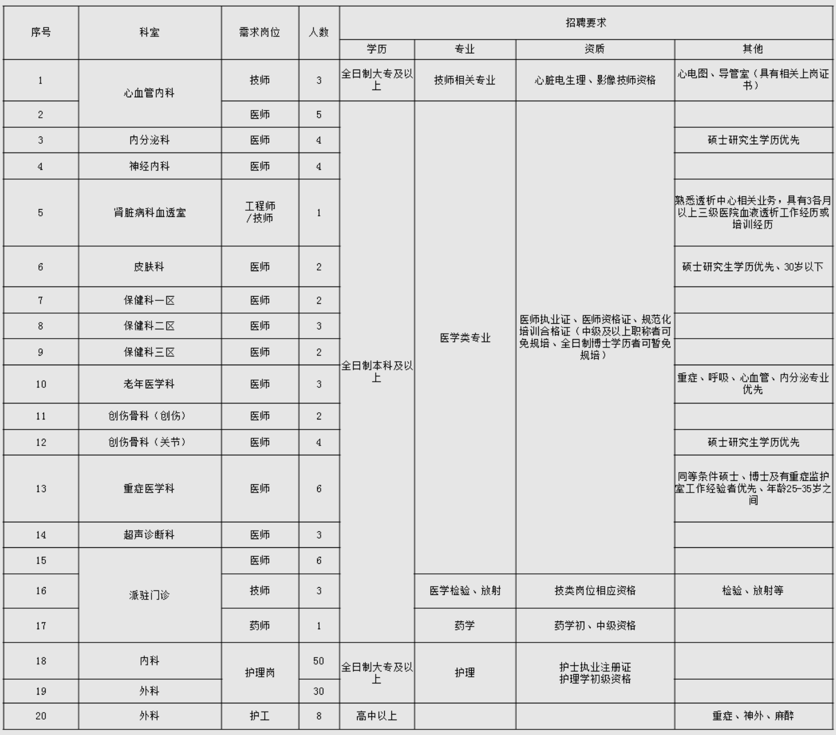 根據(jù)醫(yī)院發(fā)展需要,現(xiàn)面向社會招聘醫(yī)、藥、護(hù)、技、工程等類別人員,有臨床工作經(jīng)驗者優(yōu)先。