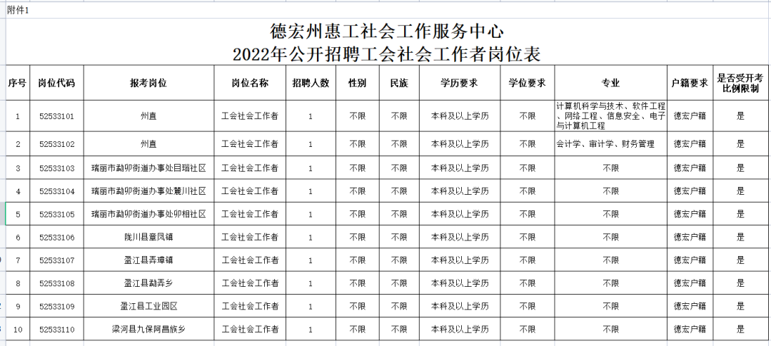 面向社會公開招聘合同制工會社會工作者10名。具體崗位、條件、要求等詳見《德宏州惠工社會工作服務(wù)中心2022年公開招聘工會社會工作者崗位表》(附件1)。