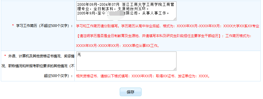 提醒:考生應(yīng)逐條填寫完整的學(xué)習(xí)、工作簡(jiǎn)歷(請(qǐng)從高中開始逐一填寫至2022.4止,不要存有斷檔時(shí)限)。招聘崗位要求全日制學(xué)歷的,請(qǐng)?jiān)趯W(xué)習(xí)簡(jiǎn)歷填寫時(shí)注明是否是全日制教育;部分崗位要求2022年普通高校應(yīng)屆畢業(yè)生的,請(qǐng)?jiān)趯W(xué)習(xí)簡(jiǎn)歷中注明畢業(yè)時(shí)間;部分崗位要求職業(yè)(資格)證書的,請(qǐng)務(wù)必在其他情況中按正確的格式如實(shí)填寫完整詳細(xì)的信息。