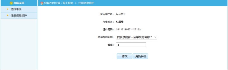通過點擊系統(tǒng)導航菜單中“注冊信息維護”選項,可跳轉到修改注冊信息頁面,如下圖所示: