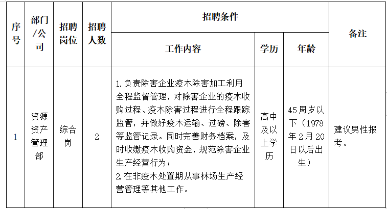 歙縣新安江林業(yè)生態(tài)發(fā)展有限公司(簡(jiǎn)稱“林發(fā)公司”)是縣屬國(guó)企歙縣經(jīng)濟(jì)開(kāi)發(fā)區(qū)投資開(kāi)發(fā)集團(tuán)有限公司的子公司,成立于2022年11月22日,主要業(yè)務(wù)為國(guó)家儲(chǔ)備林建設(shè)及“兩山”經(jīng)濟(jì)發(fā)展。目前因業(yè)務(wù)發(fā)展需要,委托黃山市仁和人力資源服務(wù)有限公司面向社會(huì)公開(kāi)招聘勞務(wù)派遣工作人員?,F(xiàn)將有關(guān)事項(xiàng)公布如下: