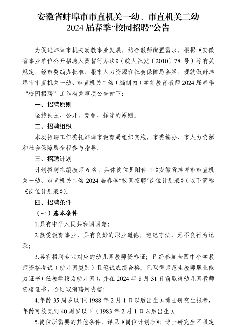 2024年蚌埠市市直機關(guān)一幼、市直機關(guān)二幼2024屆春季“校園招聘”公告