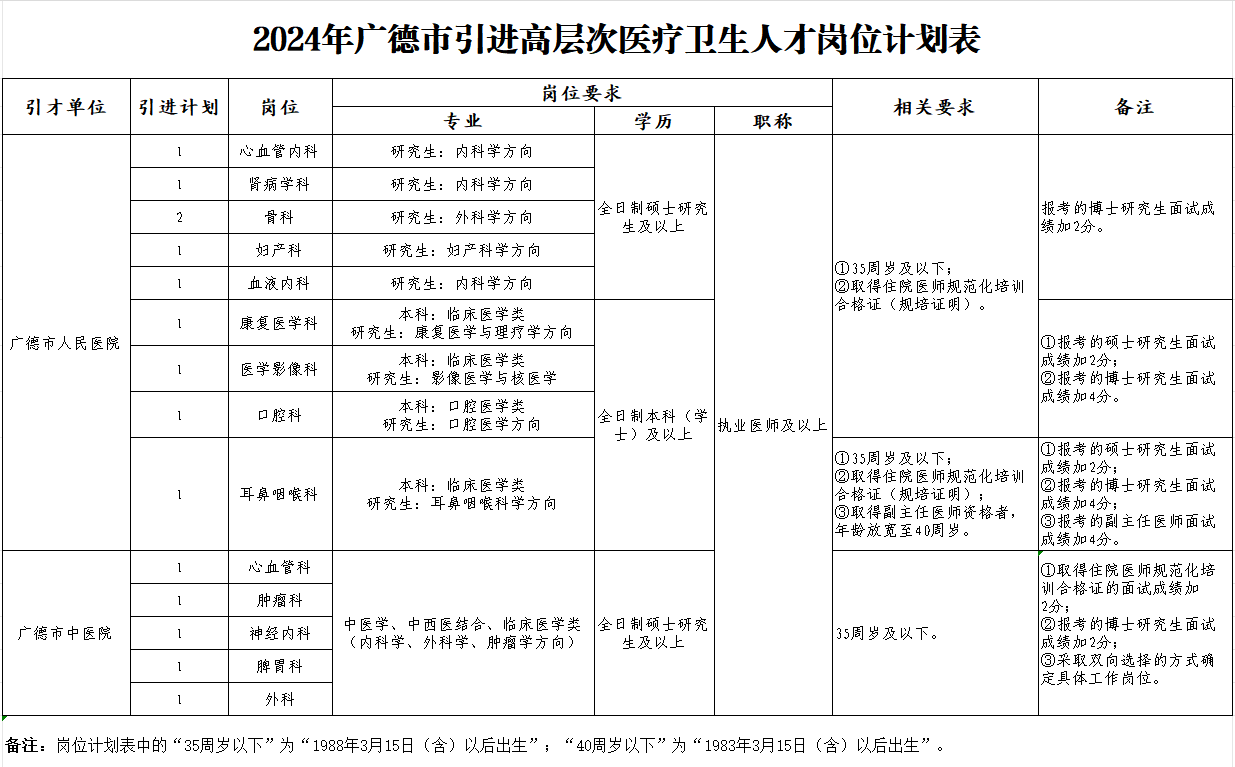 具體要求詳見附件1(《2024年廣德市引進(jìn)高層次醫(yī)療衛(wèi)生人才崗位計劃表》)。