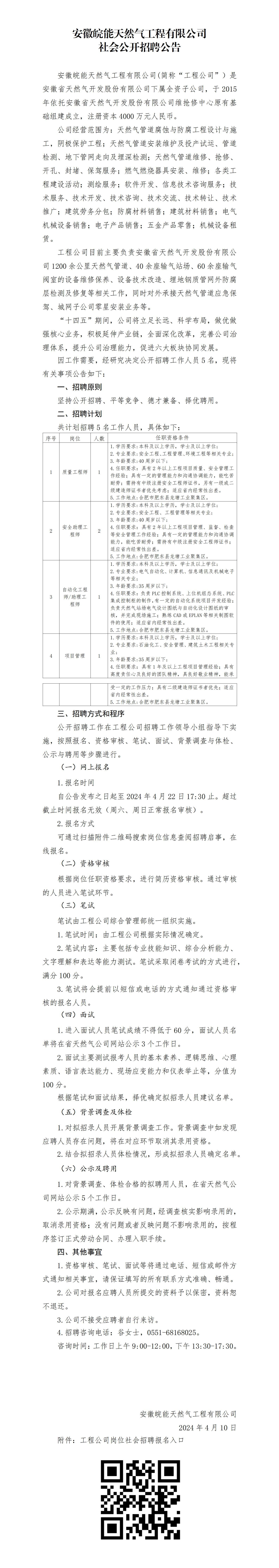 2024年安徽皖能天然氣工程有限公司社會公開招聘公告