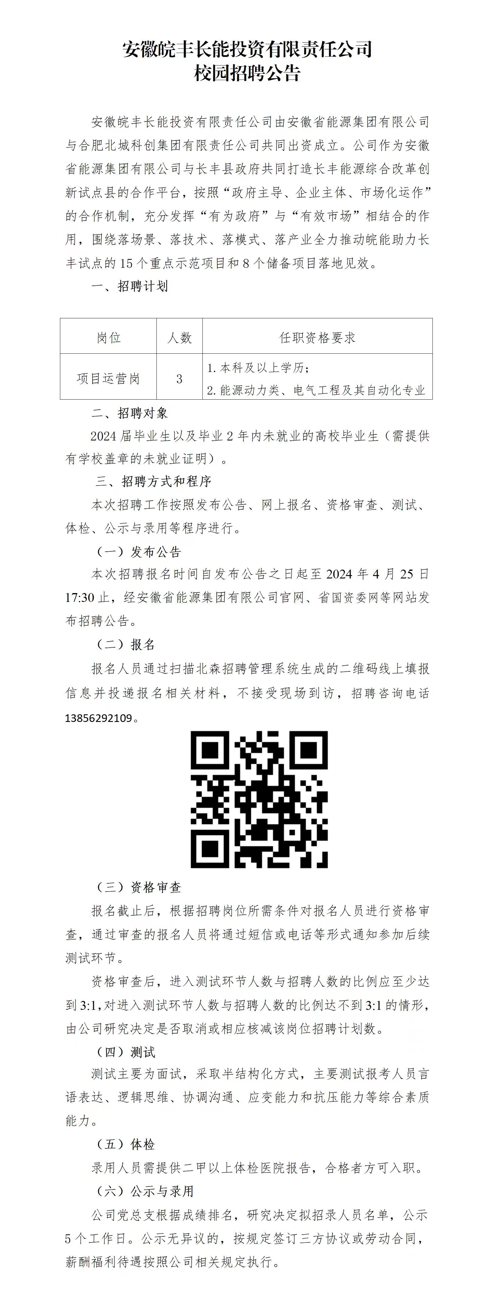 2024年安徽皖豐長能投資有限責任公司校園招聘公告
