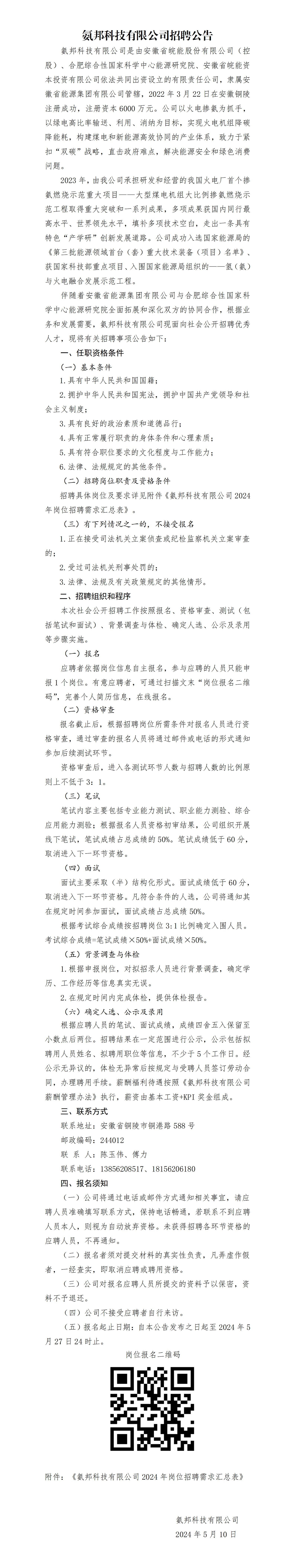 伴隨著安徽省能源集團有限公司與合肥綜合性國家科學中心能源研究院全面拓展和深化雙方的協(xié)同合作,根據(jù)業(yè)務(wù)和發(fā)展需要,氨邦科技有限公司現(xiàn)面向社會公開招聘優(yōu)秀人才,現(xiàn)將有關(guān)招聘事項公告如下: