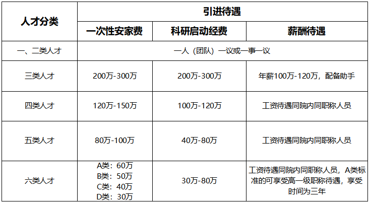 積極鼓勵引進人才團隊,實行“一事一策”,團隊成員按同層次人才上浮 10% 享受待遇;團隊科研啟動經費300-600 萬元?;虬凑請F隊人才類型對應的科研啟動經費累計計發(fā)。