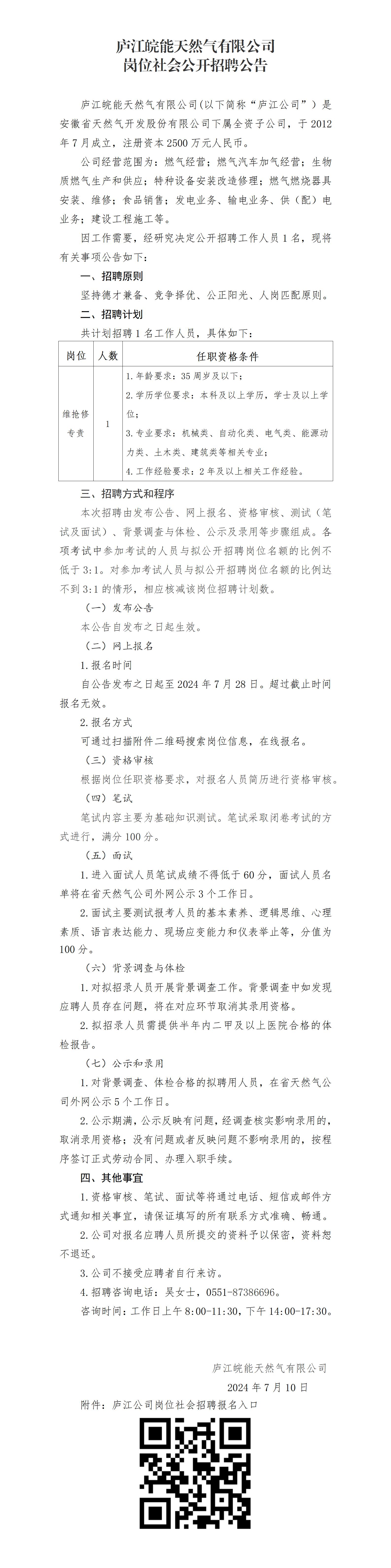 2024年合肥廬江皖能天然氣有限公司崗位社會(huì)公開招聘公告