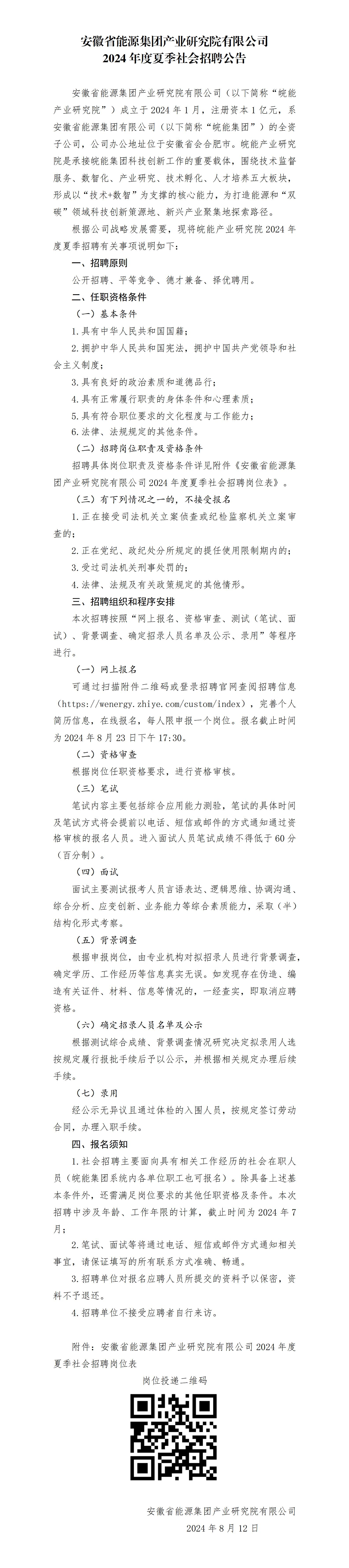 根據(jù)公司戰(zhàn)略發(fā)展需要,現(xiàn)將皖能產(chǎn)業(yè)研究院2024年度夏季招聘有關(guān)事項說明如下: