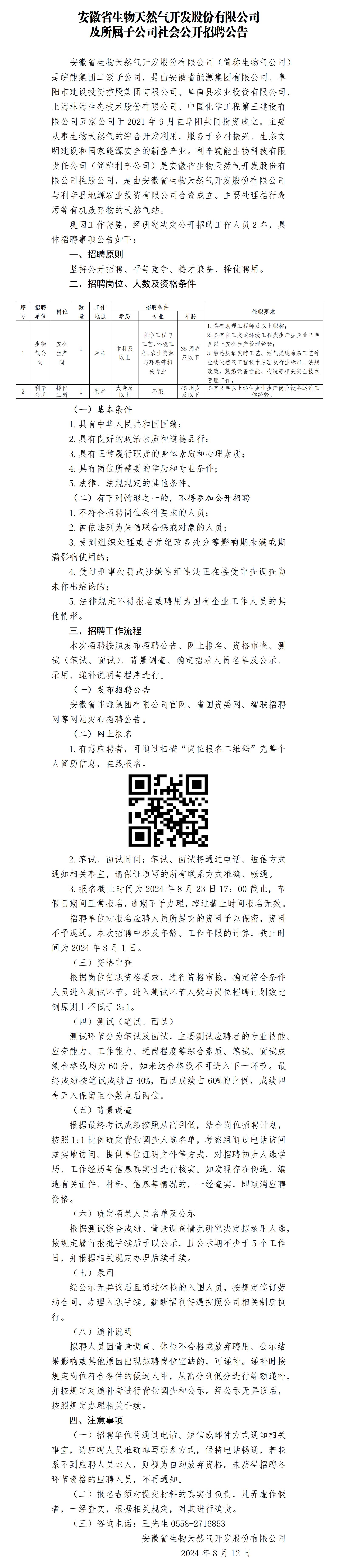 2024年阜陽(yáng)安徽省生物天然氣開發(fā)股份有限公司及所屬子公司社會(huì)公開招聘公告