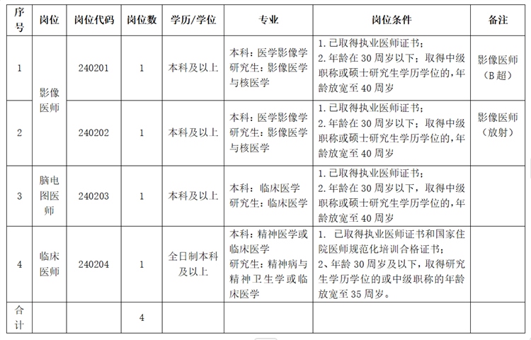2024-08-29 11:38:01閱讀()宣城市第四人民醫(yī)院為滿足醫(yī)院發(fā)展需要,加強人才隊伍建設,根據(jù)《宣州區(qū)縣級公立醫(yī)院社會化用人招聘工作暫行辦法》(衛(wèi)健辦〔2024〕31號)文件要求,結合醫(yī)院工作實際,按照公開、平等、競爭、擇優(yōu)的原則,面向社會公開招聘工作人員,現(xiàn)將有關事項公告如下: