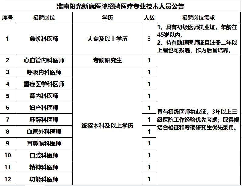 2024年淮南陽光新康醫(yī)院醫(yī)療專業(yè)技術(shù)招聘公告