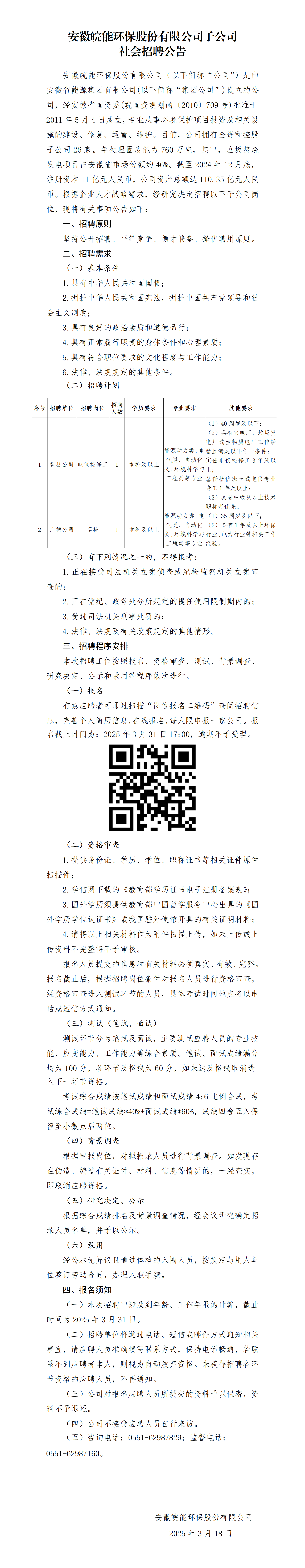 2025年安徽皖能環(huán)保股份有限公司子公司社會招聘公告