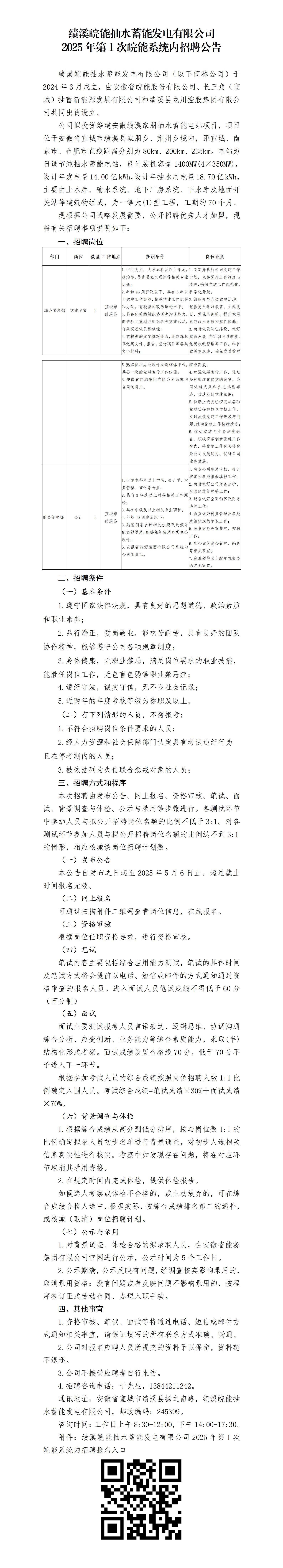 2025年宣城績(jī)溪皖能抽水蓄能發(fā)電有限公司第1次皖能系統(tǒng)內(nèi)招聘公告