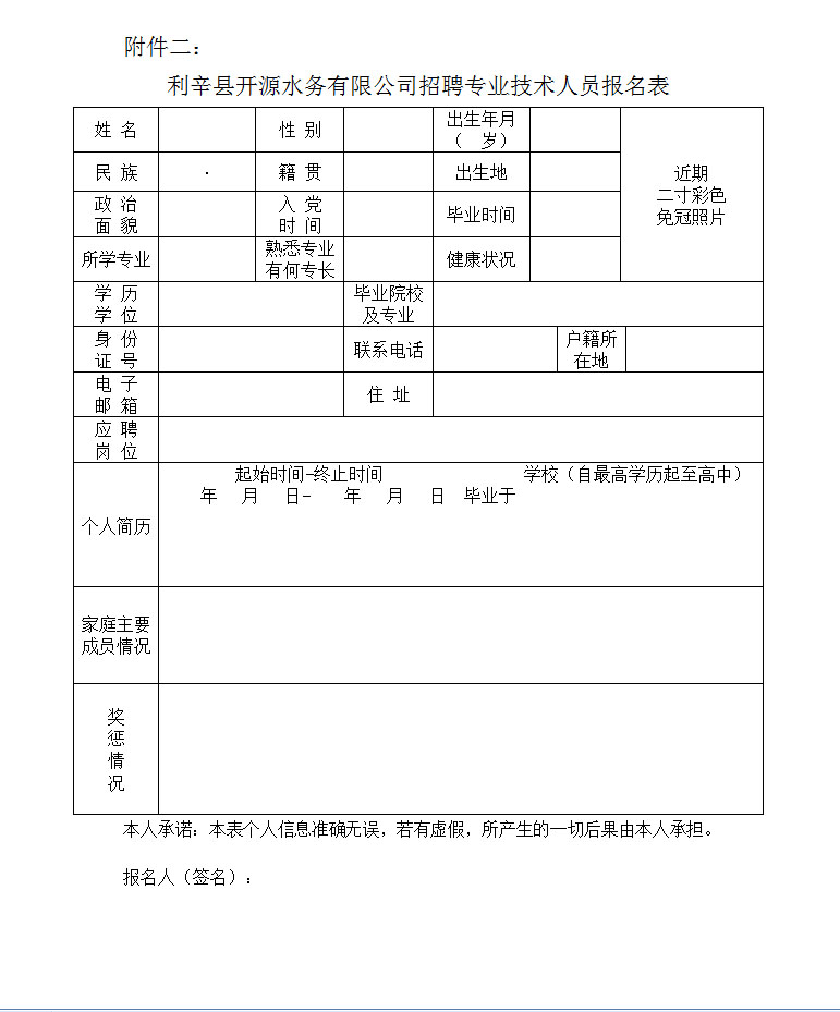 (1)《利辛縣開源水務(wù)有限公司招聘專業(yè)技術(shù)人員報名表》1份(見附件二);
