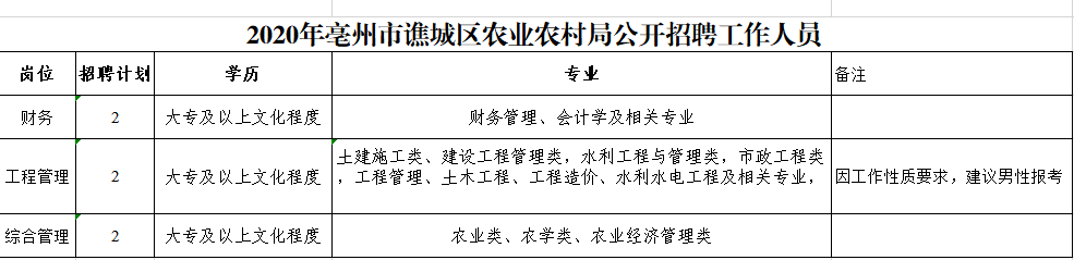 亳州市譙城區(qū)農(nóng)業(yè)農(nóng)村局公開招聘6名工作人員,現(xiàn)將招聘事項公告如下: