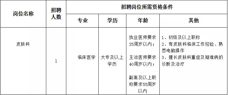 2021年潁上縣中醫(yī)院計(jì)劃公開(kāi)招聘皮膚科衛(wèi)生專業(yè)技術(shù)崗位人員1人,具體招聘崗位、人數(shù)、專業(yè)、招聘條件等詳見(jiàn)《2021年潁上縣中醫(yī)院醫(yī)療衛(wèi)生專業(yè)技術(shù)人員招聘計(jì)劃表》