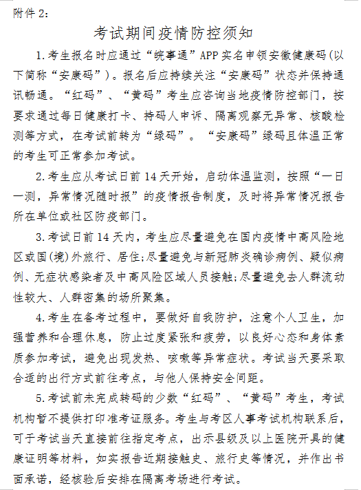 報考人員報名前,應通過“皖事通”APP實名申領“安康碼”。報考人員報考前請認真閱讀《考試期間疫情防控須知》(附件2)。報考人員提供的信息必須與本人實際情況、報考條件和所報考的崗位要求相一致。凡弄虛作假通過資格審查,其實際情況與報考條件規(guī)定不符的,一經查實,即取消考試、聘用等資格。