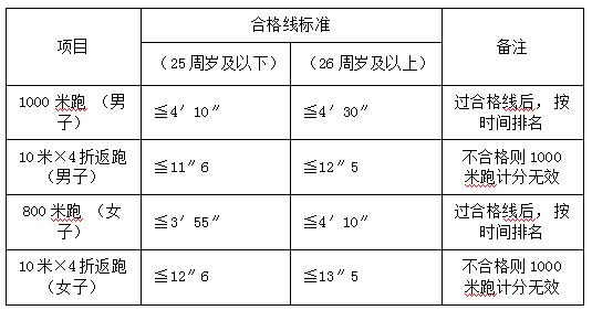 體能測試項(xiàng)目:男子1000米跑、女子800米跑,4×10米往返跑。測試標(biāo)準(zhǔn)參照《公安機(jī)關(guān)錄用人民警察體能測評(píng)項(xiàng)目和標(biāo)準(zhǔn)(暫行)》適當(dāng)放寬。