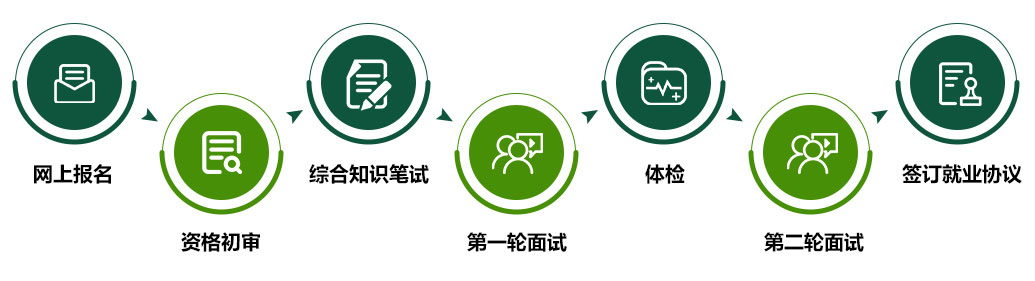 網(wǎng)上報(bào)名→資格初審→綜合知識(shí)筆試→第一輪面試→體檢→第二輪面試→簽訂就業(yè)協(xié)議。