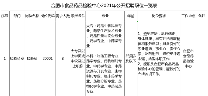 因工作需要,合肥市食品藥品檢驗(yàn)中心面向社會公開招聘3名檢驗(yàn)員,因報考人數(shù)少,結(jié)合報名情況,現(xiàn)對本次公開招聘工作做第二次調(diào)整,具體調(diào)整如下: