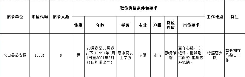 本次招聘警務(wù)輔助人員6名,具體職位見《馬鞍山市公安局含山片區(qū)招聘警務(wù)輔助人員職位表》(附件1)。