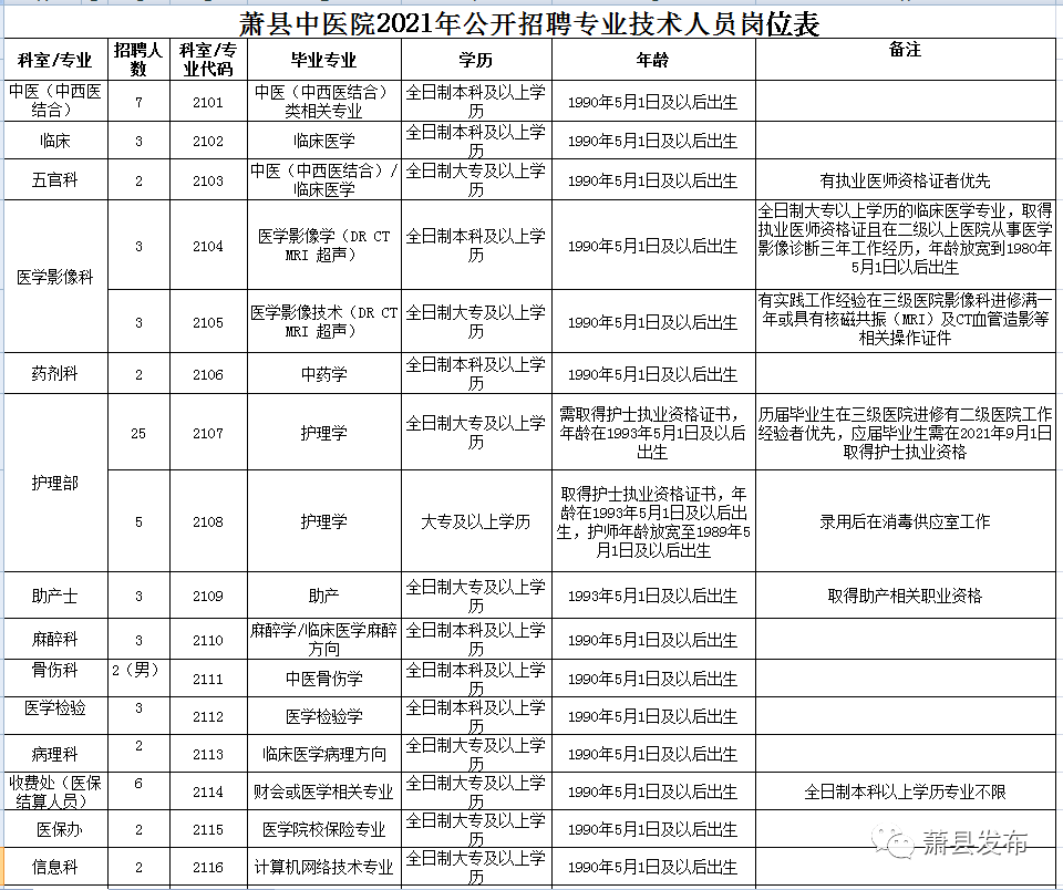 蕭縣中醫(yī)院,二級(jí)甲等中醫(yī)院,醫(yī)院設(shè)有內(nèi)科、外科、針推科、骨傷科、口腔科、婦科、肛腸科、檢驗(yàn)科、影像科等臨床醫(yī)技科室,2021年新院投入使用,增設(shè)急診科、兒科、婦產(chǎn)科、五官科、腦病科、老年病、治未病等專業(yè)科室,努力打造糖尿病治療中心、康復(fù)治療中心、腫瘤治療中心、血透中心、中醫(yī)傳統(tǒng)療法中心等特色優(yōu)勢(shì)臨床基地,增加核磁共振、DSA等各種大型高端醫(yī)療設(shè)備。為滿足全縣人民的就醫(yī)需求和醫(yī)院發(fā)展需要,經(jīng)研究決定面向社會(huì)公開招聘合同制專業(yè)技術(shù)人員104名。