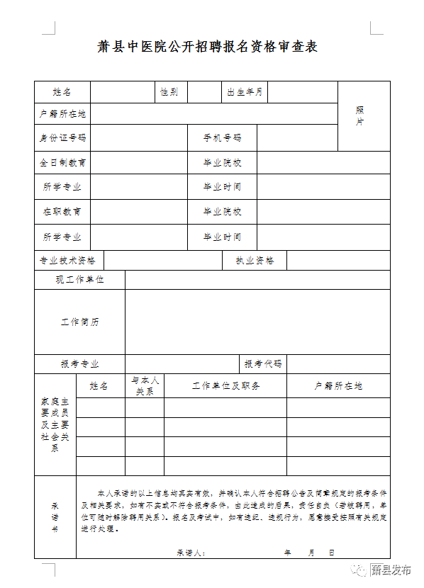 3、資格審查:報(bào)名的同時(shí)進(jìn)行資格審查,提供本人身份證、畢業(yè)證(應(yīng)屆生提供就業(yè)推薦表)、學(xué)歷證書電子注冊(cè)備案表(學(xué)信網(wǎng)打印)、學(xué)士證、執(zhí)業(yè)資格證、專業(yè)技術(shù)資格證等材料,上述證件和證明材料均要求提供原件和復(fù)印件及小2寸近期免冠正面彩色照片4張,填寫《蕭縣中醫(yī)院公開招聘人員報(bào)名表》(表格自行下載打印),每人只能選擇一個(gè)崗位報(bào)考。