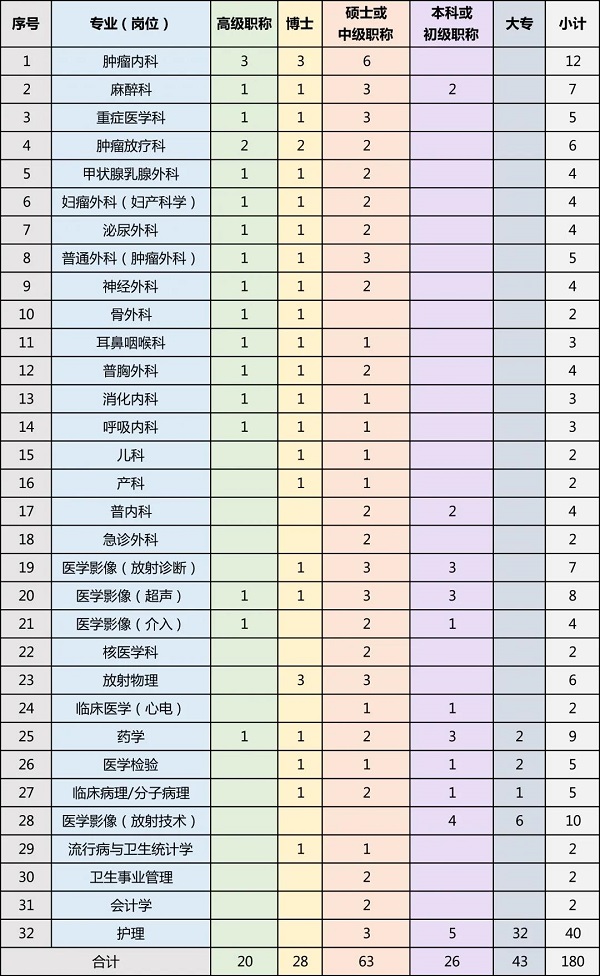 在中科院和安徽省暨合肥市的大力支持下,一所1500張床位的高水平、現(xiàn)代化三級甲等腫瘤??漆t(yī)院(高新院區(qū))正在建設中,根據(jù)醫(yī)院發(fā)展規(guī)劃,現(xiàn)面向全社會公開招聘各類專業(yè)技術人才,2020年人才招聘計劃如下:
