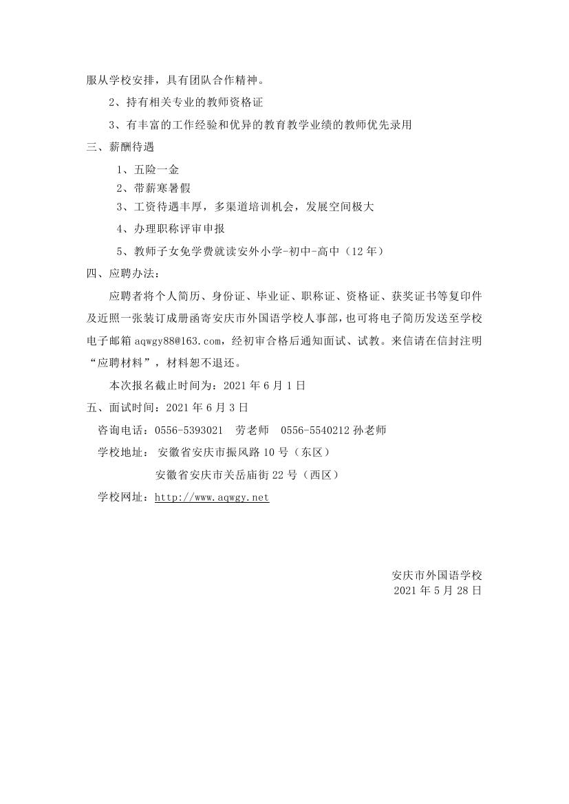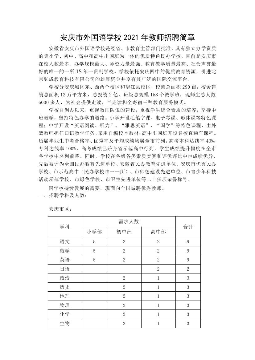 2021年安慶市外國語學(xué)校教師招聘簡章