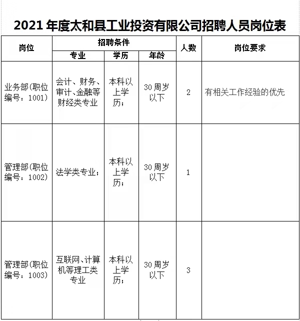 太和縣工業(yè)投資有限公司是經(jīng)太和縣人民政府批準(zhǔn),由太和縣國(guó)有資產(chǎn)管理局單獨(dú)出資設(shè)立的一家國(guó)有獨(dú)資公司。公司主營(yíng)工業(yè)項(xiàng)目投資、助保金貸款、資產(chǎn)運(yùn)營(yíng)、工業(yè)項(xiàng)目信息咨詢服務(wù)、基礎(chǔ)設(shè)施建設(shè)、棚戶區(qū)改造、農(nóng)村路網(wǎng)建設(shè)、農(nóng)業(yè)技術(shù)開(kāi)發(fā)、污水處理等?,F(xiàn)根據(jù)公司業(yè)務(wù)發(fā)展需要,擬面向社會(huì)公開(kāi)招聘6名工作人員,具體公告如下: