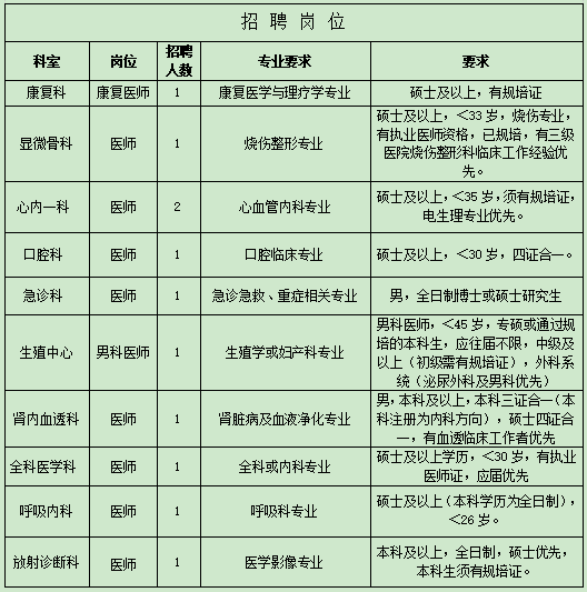 醫(yī)院根據(jù)工作需要,急招醫(yī)療、護(hù)理等部分崗位若干名。(具體見(jiàn)下表)