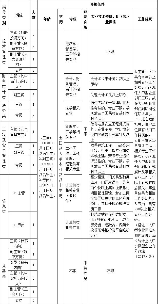 本次選聘競聘淮海實業(yè)集團機關(guān)33個崗位(見下表)。集團機關(guān)在崗工作人員參加競聘的,其資格條件按照《集團公司管理和專業(yè)技術(shù)崗位管理辦法》(淮海發(fā)〔2020〕115號)第十二條的第三、四、五款執(zhí)行;其他人員報名按以下資格條件執(zhí)行。