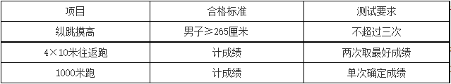 體能測試項(xiàng)目:縱跳摸高、4×10米往返跑、1000米跑。測試標(biāo)準(zhǔn)參照《公安機(jī)關(guān)錄用人民警察體能測評(píng)項(xiàng)目和標(biāo)準(zhǔn)》執(zhí)行。