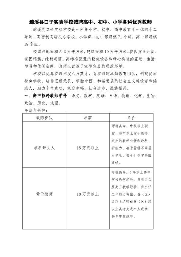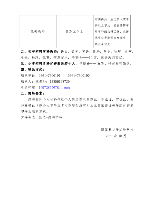 2021年淮北濉溪縣口子實(shí)驗(yàn)學(xué)校誠(chéng)聘高中、初中、小學(xué)各科優(yōu)秀教師
