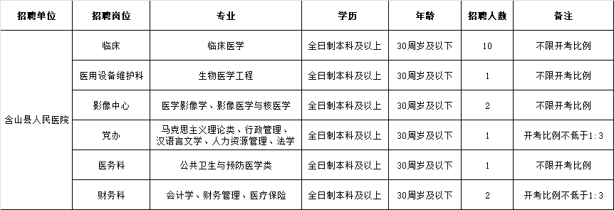 一、招聘計(jì)劃:臨床醫(yī)學(xué)10名、醫(yī)學(xué)影像學(xué)2名、財(cái)務(wù)2名、黨辦1名、公共衛(wèi)生與預(yù)防醫(yī)學(xué)1名、生物醫(yī)學(xué)工程1名,各崗位具體要求及說(shuō)明詳見《含山縣人民醫(yī)院2020年公開招聘部分崗位工作人員職位表》。
