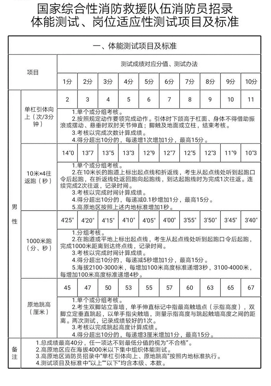 2、體能測(cè)試。對(duì)資格審查合格的人員進(jìn)行體能測(cè)試,測(cè)試項(xiàng)目為單杠引體向上、10*4往返跑、1000m跑、原地跳高。體能測(cè)試實(shí)行量化評(píng)分,有一個(gè)單項(xiàng)“不合格”的予以淘汰。