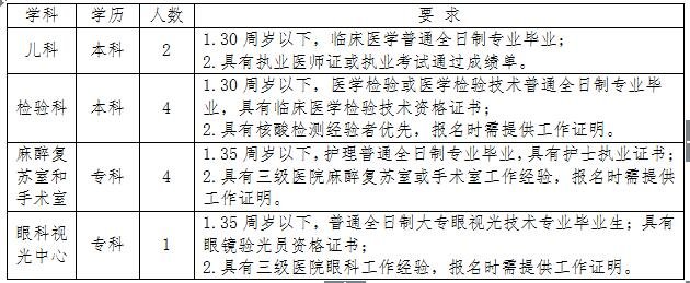 2021-12-07 20:34:27閱讀()太和縣人民醫(yī)院根據(jù)2021年招聘計劃,結(jié)合疫情期間急需崗位需要,經(jīng)2021年12月3日院長辦公會議研究,現(xiàn)對兒科、檢驗科、麻醉復蘇室、手術(shù)室和眼科視光中心急需人員面向社會公開招聘。