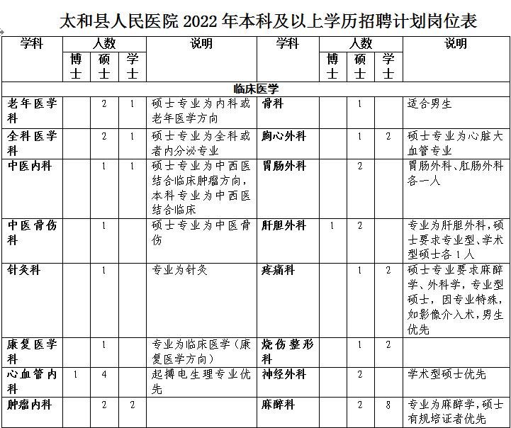 2021-12-13 12:15:24閱讀()太和縣人民醫(yī)院太和縣人民醫(yī)院始建于1949年,現(xiàn)是一所集醫(yī)療、急救、康復(fù)、保健、科研與教學(xué)于一體的三級(jí)甲等綜合醫(yī)院,全國綜合醫(yī)院中醫(yī)藥工作示范單位、省級(jí)文明醫(yī)院、國際愛嬰醫(yī)院、國家住院醫(yī)師規(guī)范化培訓(xùn)基地、安徽省助理全科醫(yī)生規(guī)范化培訓(xùn)基地、皖南醫(yī)學(xué)院附屬太和醫(yī)院、阜陽市急診醫(yī)學(xué)和重癥醫(yī)學(xué)??谱o(hù)士臨床培訓(xùn)基地、淮北職業(yè)技術(shù)學(xué)院教學(xué)醫(yī)院、太和縣120急救中心和太和縣腫瘤醫(yī)院的依托單位、中國胸痛中心(標(biāo)準(zhǔn)版)、卒中防治中心、太和縣創(chuàng)傷救治中心、高危孕產(chǎn)婦救治中心、危重新生兒救治中心,連續(xù)多年榮登“中國縣級(jí)醫(yī)院百強(qiáng)榜”。編制床位1600張;擁有磁共振2臺(tái)、CT6臺(tái)、DSA2臺(tái)以及直線加速器、PET-CT、體外循環(huán)機(jī)等國內(nèi)外先進(jìn)醫(yī)療設(shè)備。開設(shè)43個(gè)臨床學(xué)科、15個(gè)醫(yī)技科室;省級(jí)重點(diǎn)特色專科3個(gè)、市級(jí)重點(diǎn)專科10個(gè),35萬平方米新院區(qū)將于2023年啟用。根據(jù)學(xué)科建設(shè)需要,2022年計(jì)劃招聘本科及以上學(xué)歷畢業(yè)生若干名,現(xiàn)將有關(guān)事項(xiàng)公告如下: