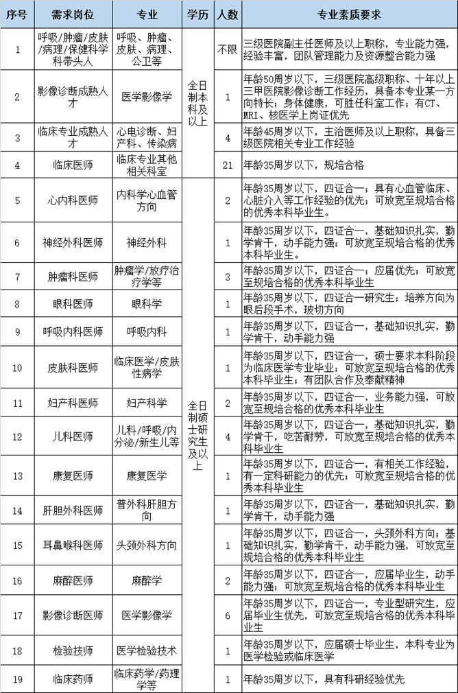 3、 “招聘崗位及要求”中未列出的專(zhuān)業(yè)崗位,優(yōu)秀碩士及以上研究生和已規(guī)培人員也可以電話咨詢(xún)或報(bào)名。